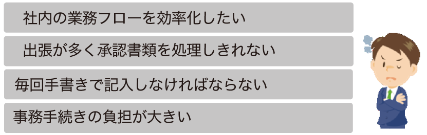| 社内の承認業務が手書きと印鑑・・・時間もかかるしミスも多い。効率化したい | |